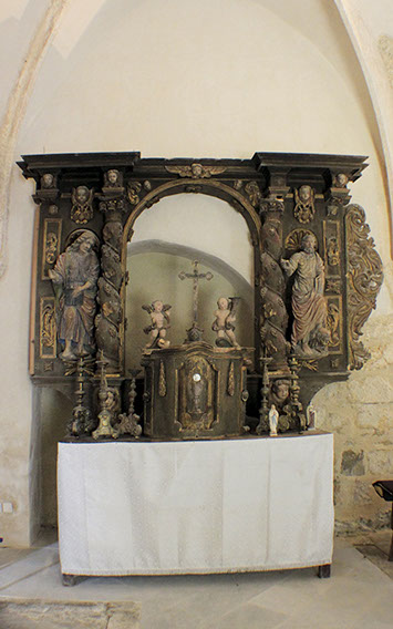 OLTAR SV. JURJAOltar sv. Jurja jedini je sačuvani oltar od nekadašnjih četiriju baroknih oltara koji su se nalazili u kapeli. Nekad je oltar bio postavljen na gotičku menzu u svetištu, a sada je smješten uz sjeverni zid lađe. Oltar je datiran u posljednje desetljeće 17. st. Prema vizitacijama, nekad je imao u sredini kip sv. Jurja između evanđelista Ivana i Marka, koji stoje na konzolama. Povrh je bila atika. Tijekom godina oltar je dosta izmijenjen: umjesto kipa sv. Jurja umetnuta je slika na platnu sv. Jurja, slikara Ivana Krstitelja Rangera. Od cijelog oltara ostala je netaknutom samo arhitektura donjeg dijela retabla, tako da središnji dio zauzima tabernakul s anđelima lučonošama. Uz vanjske rubove retabla bila su pričvršćena dekorativna krila s akantusovim lišćem i cvjetovima, od kojih je danas na oltaru samo desno krilo sačuvano. Prema vizitaciji iz 1708. na atici postoji kip Spasitelja između svetaca Ignacija i Ksavera, dok je prema opisu D. Baričević iz 1972. na atici bila u sredini novija slika Bogorodice između svetaca Stjepana i Franje Ksaverskog. Danas atike nema, a na župnom dvoru pohranjene su skulpture navedenih svetaca iz zadnjeg opisa te još kipovi apostola Petra i Pavla, koji očito potječu s jednog od porušenih oltara (najvjerojatnije s oltara sv. Barbare).