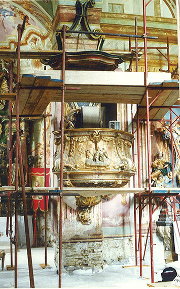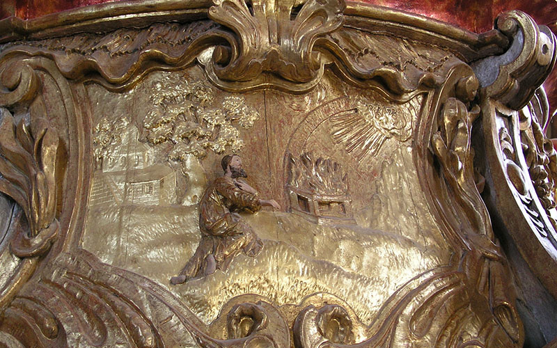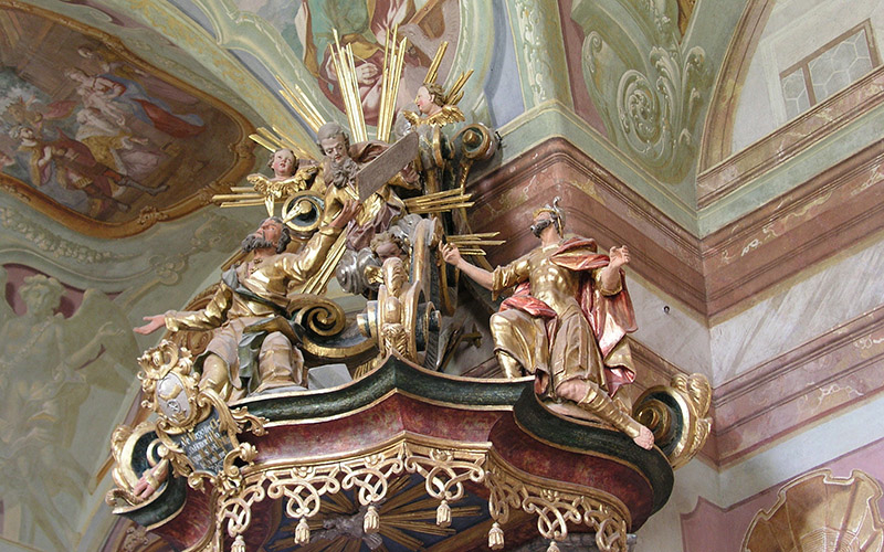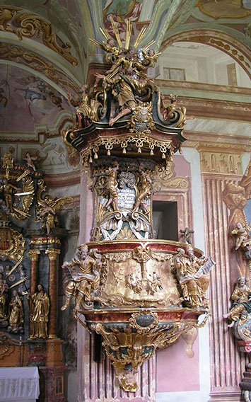 Godine 1743. podignuta je čuvena propovjedaonica pomoću donacija mještana, župnika Kuneka i Ignacija Bedekovića Komorskog. Tematika propovjedaonice je isključivo strozavjetna - na oplošju govornice nalaze se tri reljefa razdjeljenja kipovim proroka Jeremije i Izaije, sa sljedećim prizorima: Noine žrtve paljenice, plesa oko zlatnog teleta i sna Jakovljeva o nebeskim ljestvama. Na pozadinskoj stijeni stoje figure Kaleba i Jošue, dok je u gornjem dijelu propovjedaonice scena predaje poloča Dekloga Mojsiju, uz kojeg su smješteni kipovi Arona i vojskovođe Jošue. Propovjedaonica je rad majstora Josipa Schokotnigga iz Graza te se ovom majstoru pripisuju i dva pobočna oltara belečke crkve.