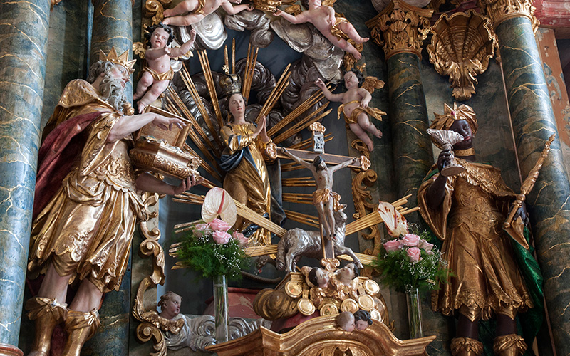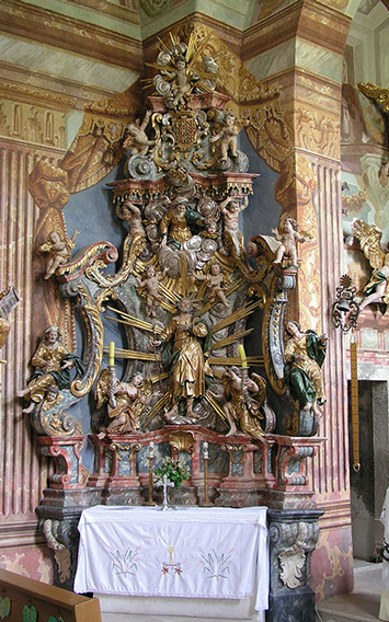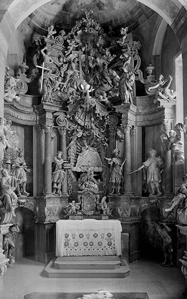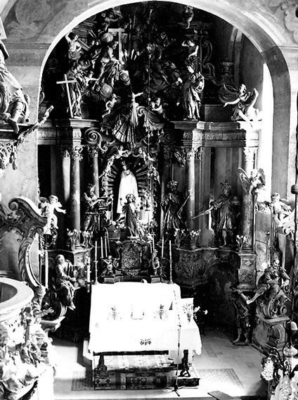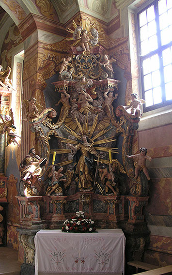 Glavni oltar posvećen je Majci Božjoj i Presvetom Trojstvu, rad je nepoznatog majstora i postavljen je 1743. donacijom Baltazara Bedekovića Komorskog i njegove žene Helene Rozalije Somogy. Cijeli oltar počiva na dvojici Atlanta. Centralni dio oltara zauzima niša s kipom Marije Immaculate koja stoji na zemaljskoj kugli te se smatra kako ovaj kip potječe s oltara prvotne kapele. Oko BDM Snježne raspoređena su četiri kralja: Gašpar, Melkior, Baltazar i Stjepan, ugarski kralj. U gornjoj zoni oltara je Presveto Trojstvo te kipovi sv. Jelene Križarice i sv. Rozalije. Pobočni oltari sv. Josipa, dar grofa Ivana Franje Čikulina, i sv. Barbare, dar Nikole Vojkovića, postavljeni su oko 1743., ali su bili dovršeni, oslikani i pozlaćeni tek početkom 60-tih zahvaljujući donacijama dviju udovica: Cecilije Praskač i Cecilije Najšić.