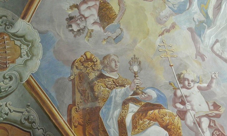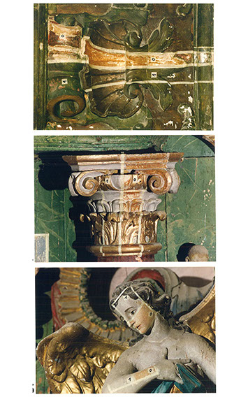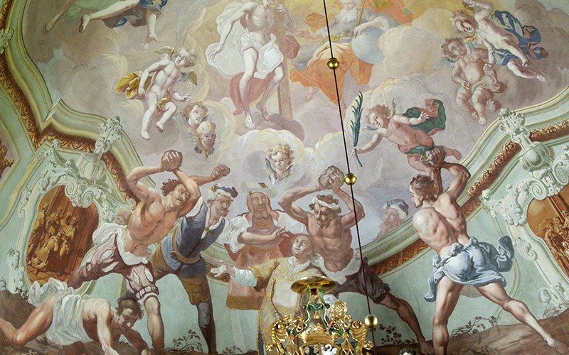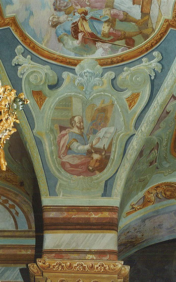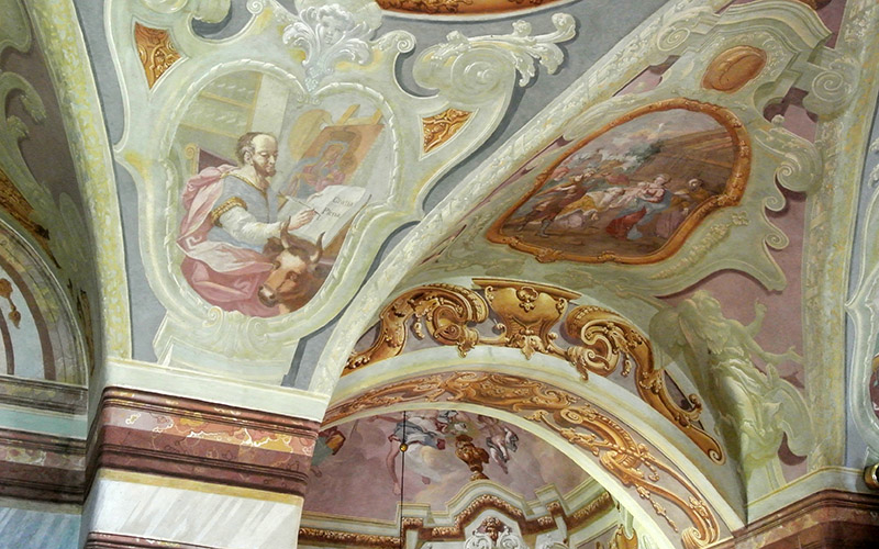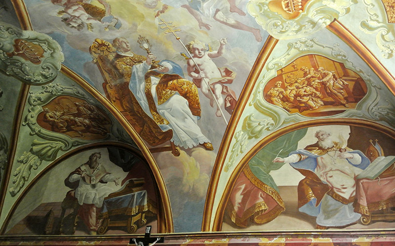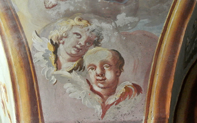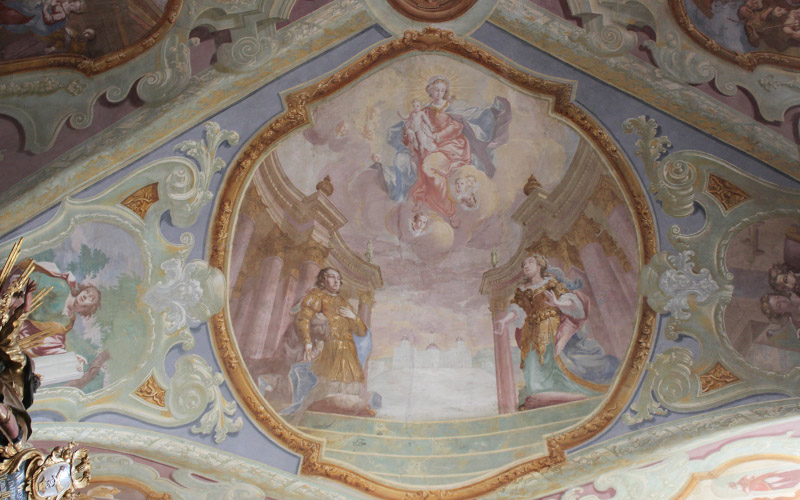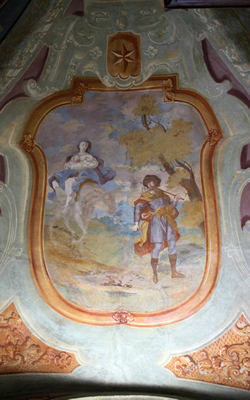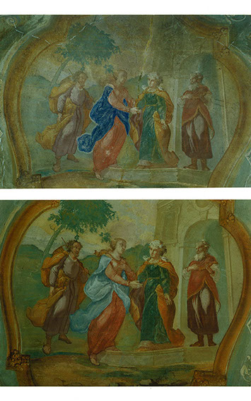Na susvodnicama su prikazane scene iz Marijinog života pa takom redom od svetišta nalazi se prikaz Navještenje, Pohod Bogorodice Elizabeti, Rođenje Krista, Poklonstvo sveta tri kralja, Obrezanje Gospodinovo te Bijeg u Egipat. Svod kapele Gospe od ružarija prikazuje anđele kako lebde među oblacima u iluzionistički naslikanom nebu. Na svodu kapele sv. Stjepana prikaz je kamenovanja sv. Stjepana: dinamično prikazani likovi bacaju kamenje na ovog mučenika u klečečem položaju. Niže zone zida u crkvi oslikane su arhitektonskim elementima i ornamentima koji stvaraju iluziju prostora. Sakristija je također oslikana zidnim slikama: na svodu i zidovima prikazani su u polukružnom formatu crkveni oci, dok su u manjim medaljonima prizori iz Starog i Novog zavjeta. Prikazane su sljedeće scene: Krštenje Kristovo, Svadba u Kani Galilejskoj, sv. Petar apostol ozdravljuje hromoga, sv. Petar ozdravljuje bolesnoga, Apostoli ozdravljuju bolesnike i sv. Marija Magdalena pere Isusu noge. Zidne slike koje je Ranger izveo u belečkoj crkvi nastale su prema predlošcima jezuita Andrea Pozze, talijanskog slikara i arhitekta, poznatog po iluzionističkom slikanju arhitekture.